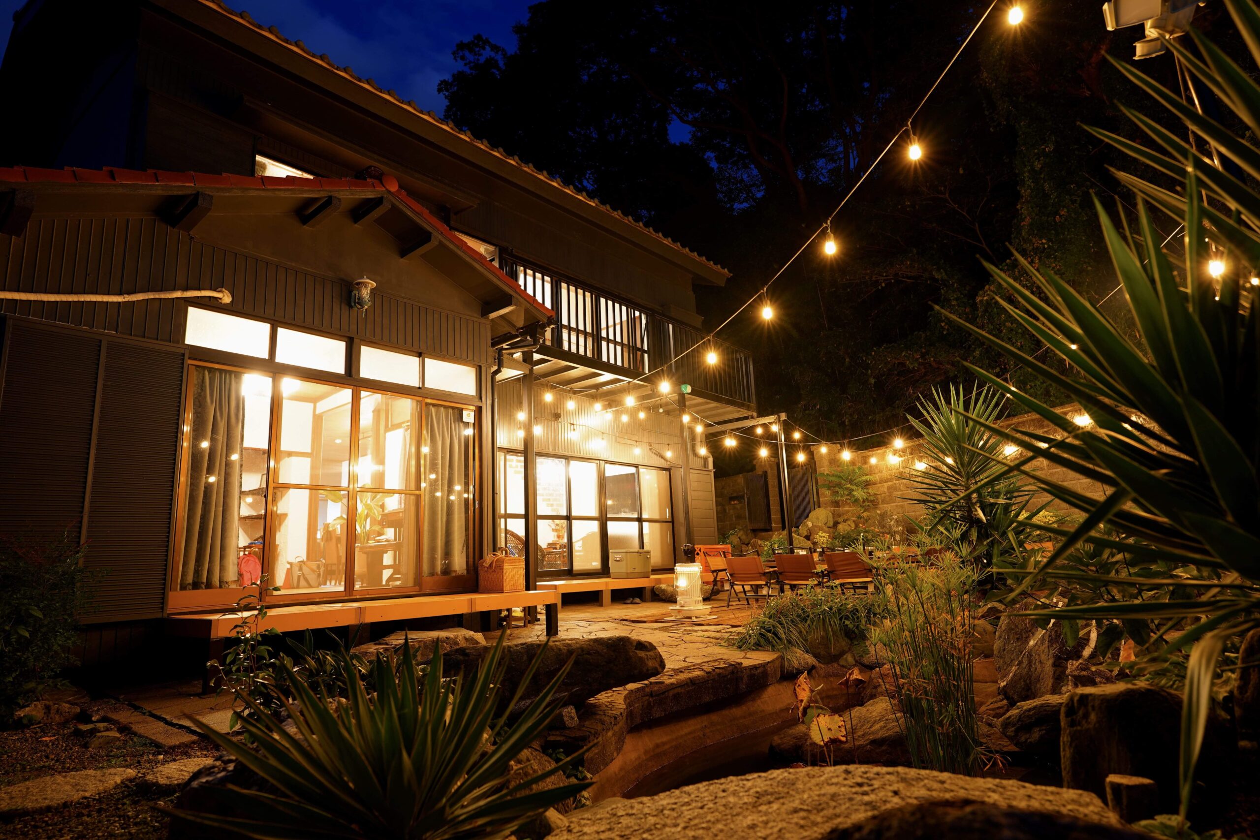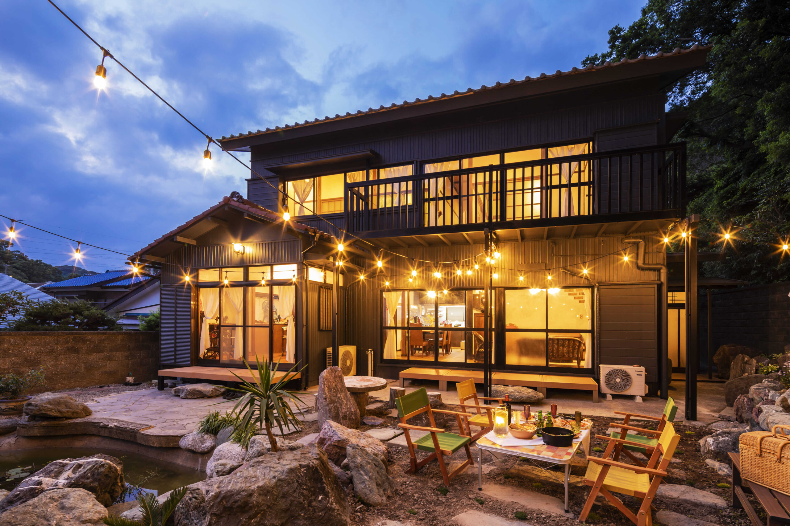 築50年の家をひょんなことから手に入れ、夫婦でDIYを手がけた始まりの古民家。張り替えた床はすべて無垢材を使用。お庭では雰囲気のいい照明とグリーンでBBQを楽しめます。