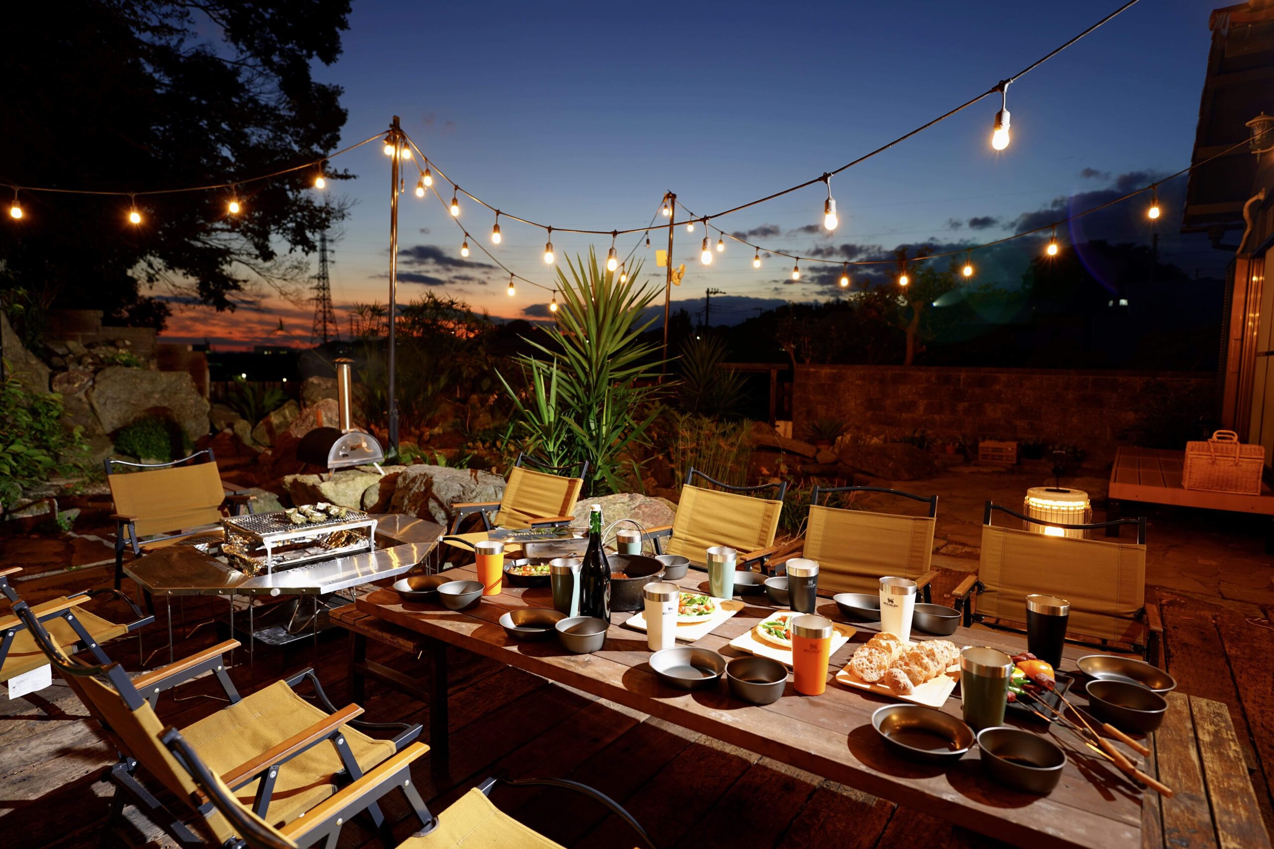 夜はお庭が電球で照らされ、おしゃれな雰囲気でBBQが楽しめます。ワインが合いそう♡お外でのBBQ,ご歓談は21時までとさせていただきます。